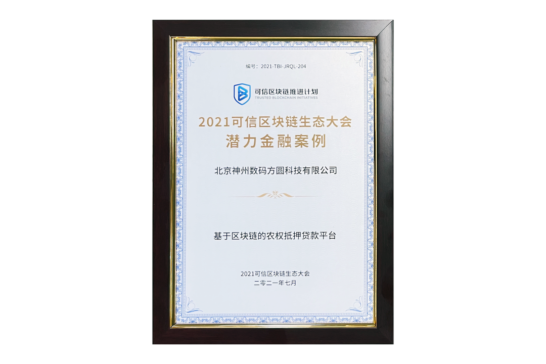 7月13日,由中国信息通信研究院、可信区块链推进计划主办的“2021可信区块链生态大会”在京举办,并隆重发布系列成果。神州信息子公司北京ok138cn太阳方圆科技有限公司(简称:神州方圆)推荐的“基于区块链的农权抵押贷款平台”荣获十大金融应用高潜力案例,为“区块链+农业”落地带来示范效应。